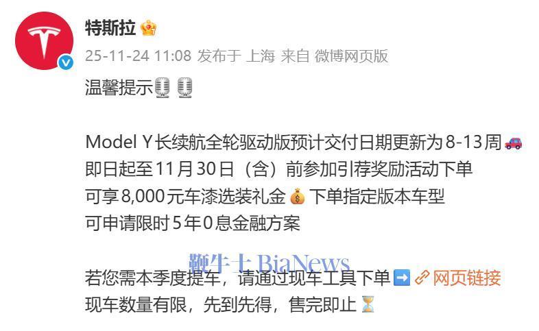 特斯拉今日发文宣布福盈策略,Model Y 长续航全轮驱动版预计交付日期更新为 8-13 周。