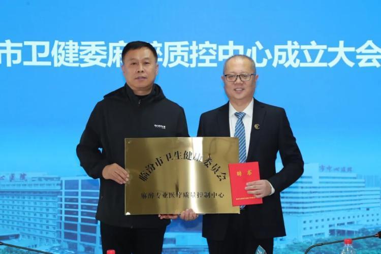 会上,临汾市卫健委一级调研员毛崇澜向临汾市中心医院麻醉科主任王志国颁发市卫健委麻醉专业质控部牌匾及主任证书。